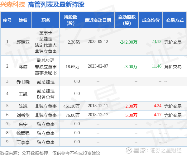 证券之星消息,根据9月24日市场公开信息、上市公司公告及交易所披露数据整理,兴森科技(002436)最新董监高及相关人员股份变动情况:2025年9月23日公司董事,高管邱醒亚共增持公司股份5.0万股,占公司总股本为0.0029%。变动期间公司股价下跌3.0%,9月23日当日收盘报23.26元。