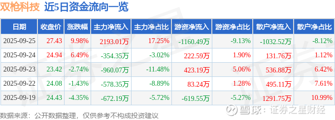 证券之星消息,双枪科技9月25日涨停收盘,收盘价27.43元。该股于9点42分涨停,未打开涨停,截止收盘封单资金为1.37亿元,占其流通市值7.47%。
