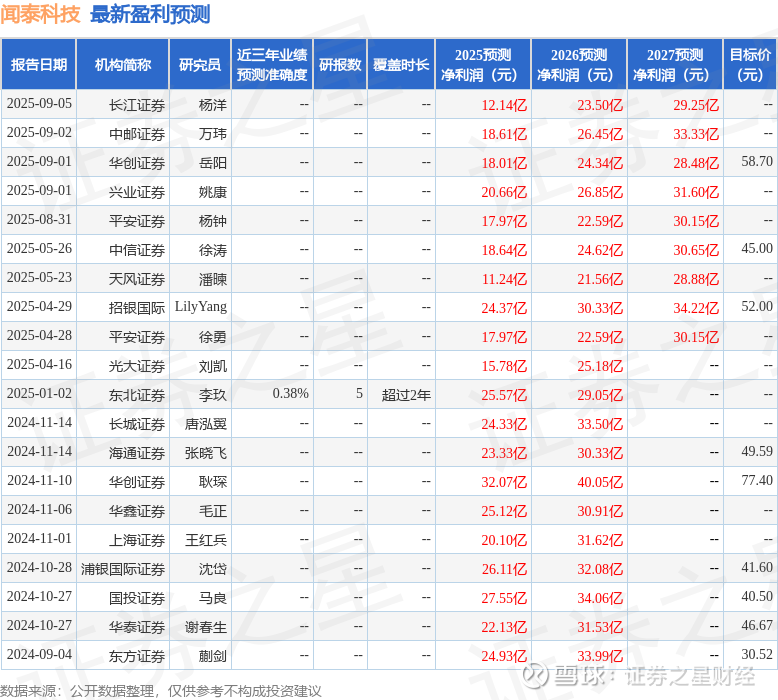 最新盈利预测明细如下:
