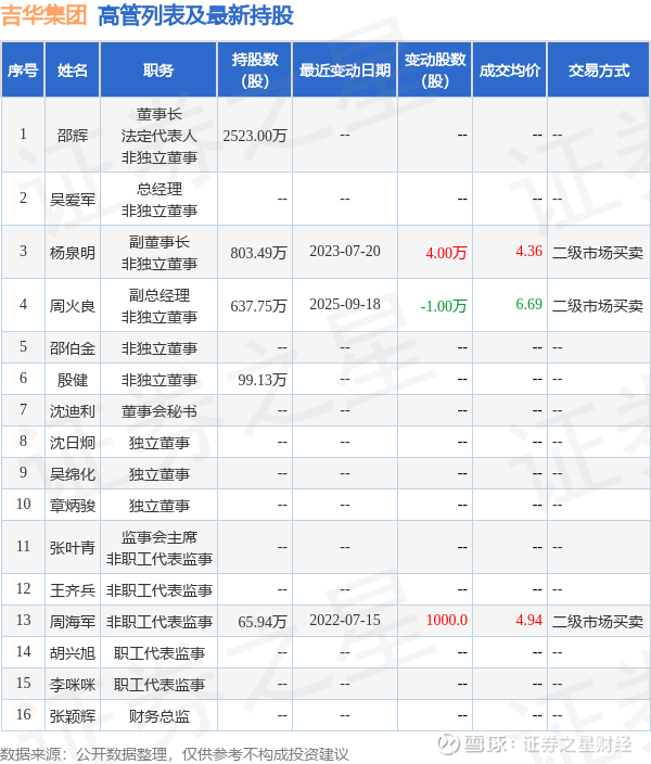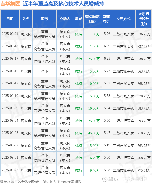 吉华集团近半年内的董监高及核心技术人员增减持详情如下: