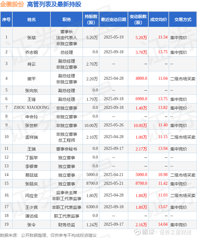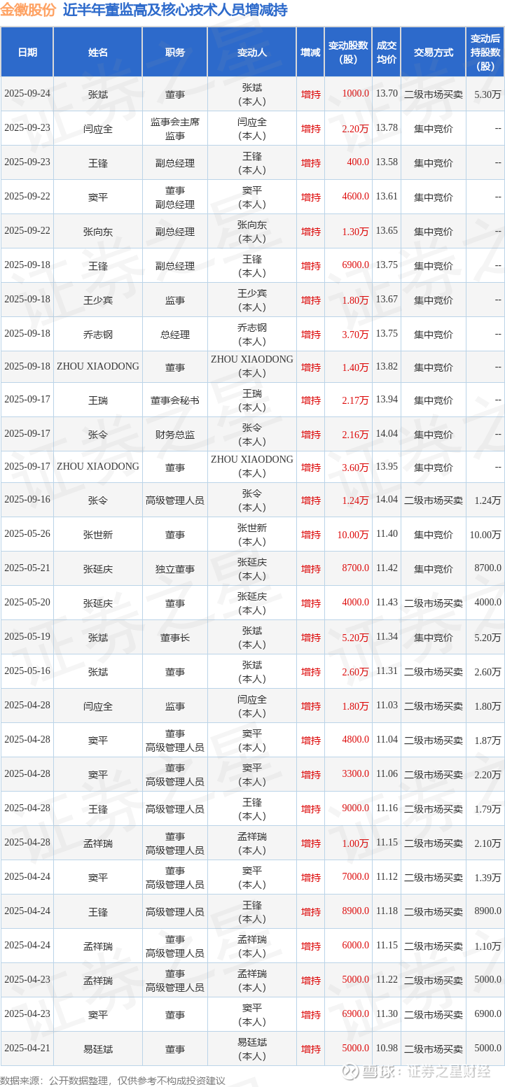 金徽股份近半年内的董监高及核心技术人员增减持详情如下: