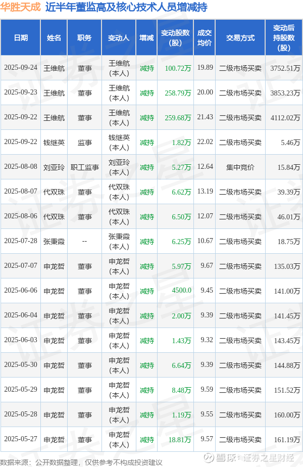 华胜天成近半年内的董监高及核心技术人员增减持详情如下:
