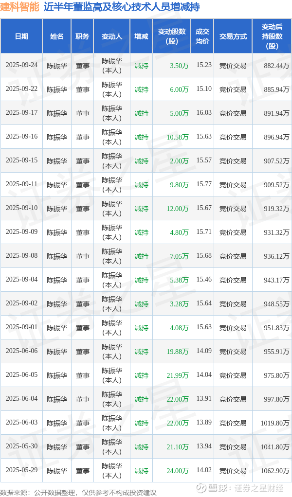 建科智能近半年内的董监高及核心技术人员增减持详情如下: