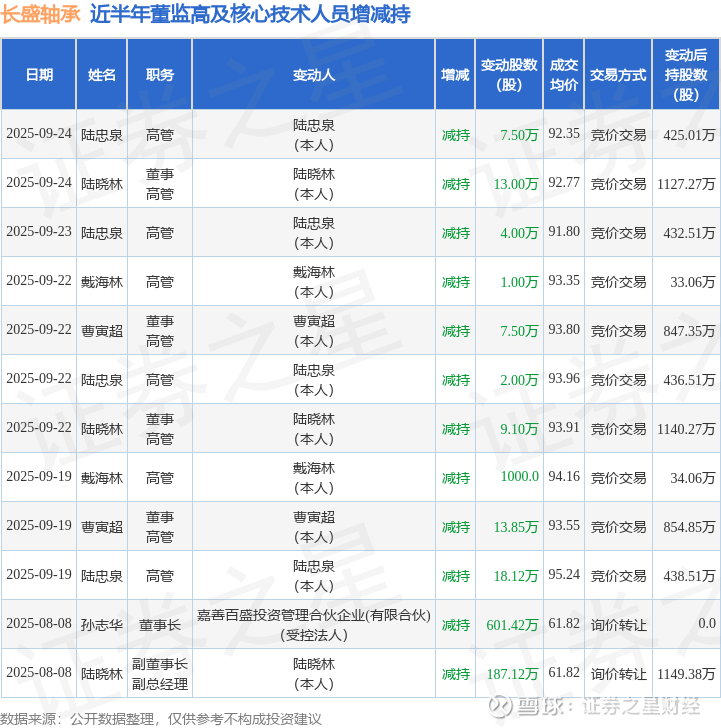 长盛轴承近半年内的董监高及核心技术人员增减持详情如下: