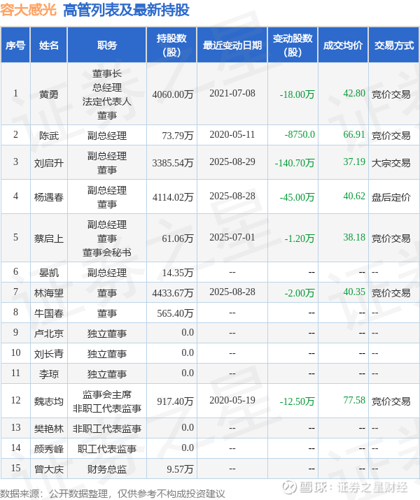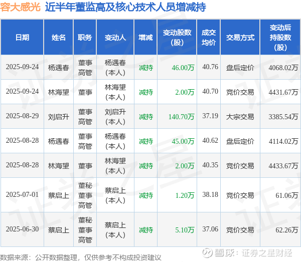 容大感光近半年内的董监高及核心技术人员增减持详情如下: