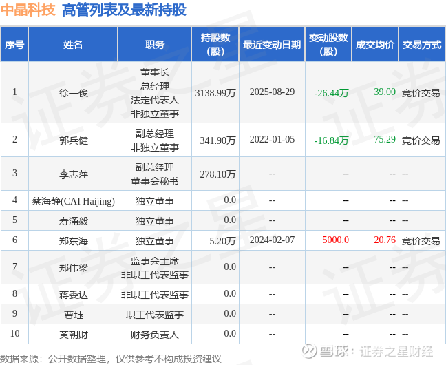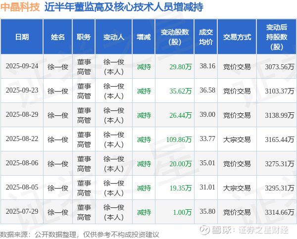 中晶科技近半年内的董监高及核心技术人员增减持详情如下:
