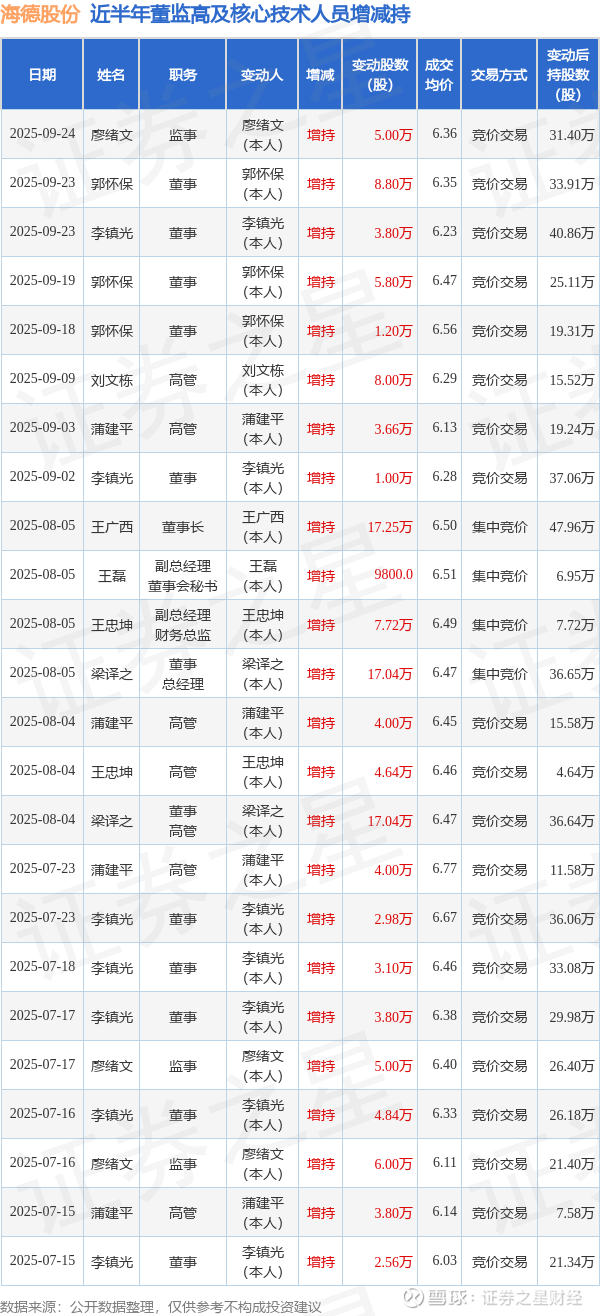 海德股份近半年内的董监高及核心技术人员增减持详情如下: