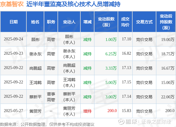 京基智农近半年内的董监高及核心技术人员增减持详情如下: