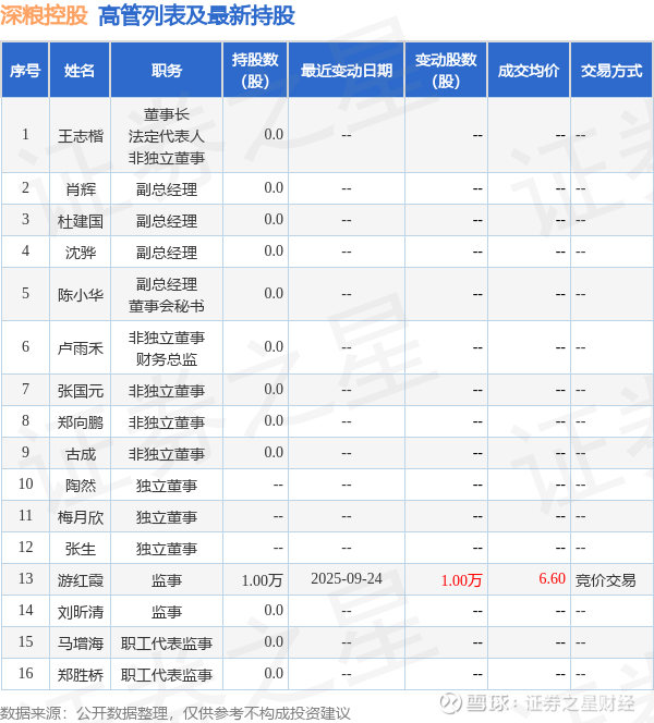 证券之星消息,根据9月25日市场公开信息、上市公司公告及交易所披露数据整理,深粮控股(000019)最新董监高及相关人员股份变动情况:2025年9月24日公司监事游红霞共增持公司股份1.0万股,占公司总股本为0.0009%。变动期间公司股价上涨0.46%,9月24日当日收盘报6.6元。