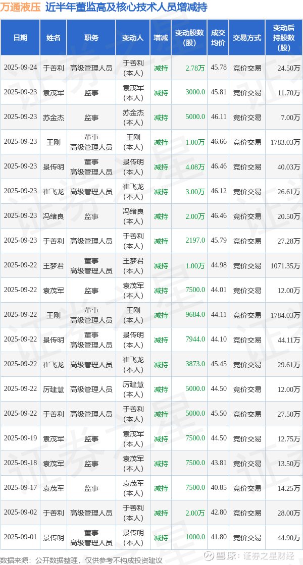 证券之星消息,根据9月26日市场公开信息、上市公司公告及交易所披露数据整理,万通液压(830839)最新董监高及相关人员股份变动情况:2025年9月24日公司高级管理人员于善利共减持公司股份2.78万股,占公司总股本为0.0233%。变动期间公司股价下跌2.89%,9月24日当日收盘报44.09元。