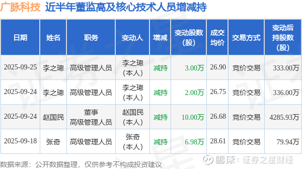 证券之星消息,根据9月26日市场公开信息、上市公司公告及交易所披露数据整理,广脉科技(838924)最新董监高及相关人员股份变动情况:2025年9月25日公司高级管理人员李之璁共减持公司股份3.0万股,占公司总股本为0.028%。变动期间公司股价下跌2.96%,9月25日当日收盘报26.2元。