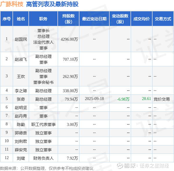 广脉科技近半年内的董监高及核心技术人员增减持详情如下: