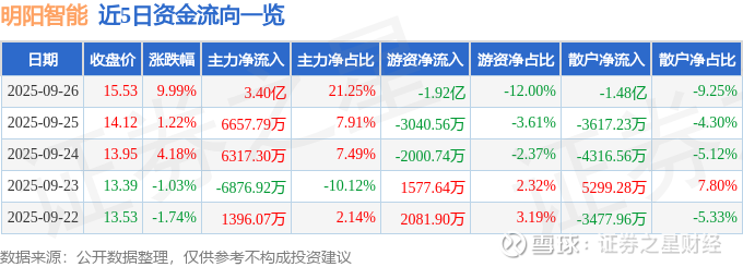 证券之星消息,明阳智能9月26日涨停收盘,收盘价15.53元。该股于9点34分涨停,5次打开涨停,截止收盘封单资金为5695.76万元,占其流通市值0.16%。