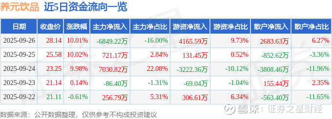证券之星消息,养元饮品9月26日涨停收盘,收盘价28.14元。该股于9点25分涨停,1次打开涨停,截止收盘封单资金为1.01亿元,占其流通市值0.29%。