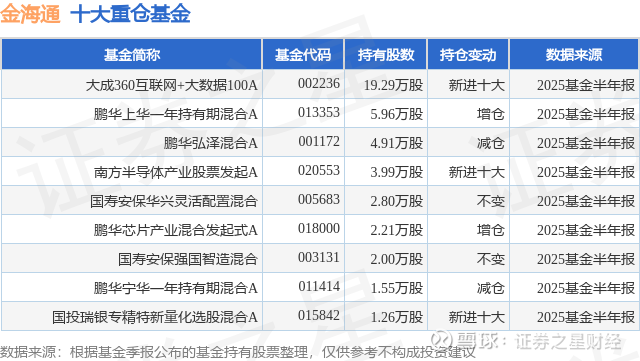 根据2025基金半年报公募基金重仓股数据,重仓该股的公募基金共9家,其中持有数量最多的公募基金为大成基金的大成360互联网+大数据100A。大成360互联网+大数据100A目前规模为6.98亿元,最新净值3.1878(9月25日),较上一交易日下跌0.4%,近一年上涨84.02%。该公募基金现任基金经理为夏高。夏高在任的基金产品包括:大成沪深300增强发起式A,管理时间为2021年2月23日至今,期间收益率为-7.97%;大成动态量化配置策略混合A,管理时间为2023年4月14日至今,期间收益率为11.21%;大成中证500指数增强A,管理时间为2024年7月19日至今,期间收益率为47.56%。
