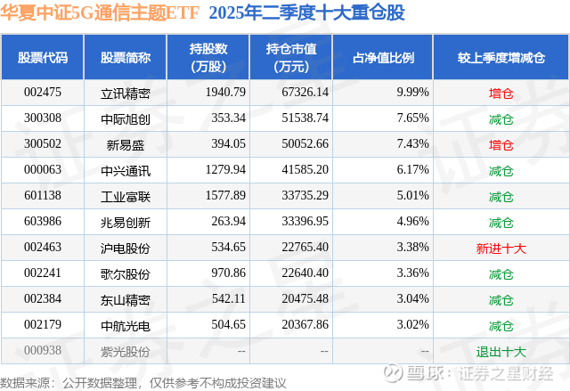 华夏中证5G通信主题ETF的前十大重仓股如下: