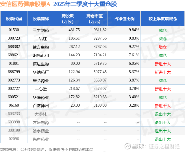 根据2025基金半年报公募基金重仓股数据,重仓该股的公募基金共23家,其中持有数量最多的公募基金为安信基金的安信医药健康股票A。安信医药健康股票A目前规模为4.42亿元,最新净值1.5653(9月25日),较上一交易日下跌0.72%,近一年上涨87.82%。该公募基金现任基金经理为池陈森。