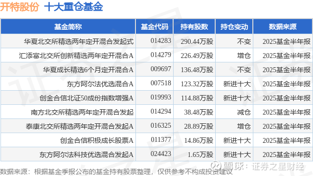 根据2025基金半年报公募基金重仓股数据,重仓该股的公募基金共9家,其中持有数量最多的公募基金为华夏基金的华夏北交所精选两年定开混合发起式。华夏北交所精选两年定开混合发起式目前规模为9.06亿元,最新净值2.6455(9月25日),较上一交易日下跌0.71%,近一年上涨241.97%。该公募基金现任基金经理为顾鑫峰。顾鑫峰在任的基金产品包括:华夏成长精选6个月定开混合A,管理时间为2020年6月12日至今,期间收益率为64.41%;华夏核心制造混合A,管理时间为2024年12月23日至今,期间收益率为49.8%。
