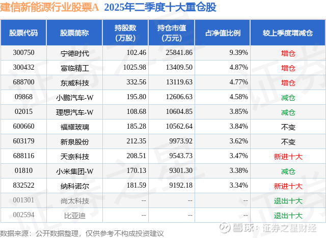 根据2025基金半年报公募基金重仓股数据,重仓该股的公募基金共43家,其中持有数量最多的公募基金为建信基金的建信新能源行业股票A。建信新能源行业股票A目前规模为25.86亿元,最新净值1.8521(9月25日),较上一交易日上涨1.25%,近一年上涨43.85%。该公募基金现任基金经理为陶灿 田元泉。陶灿在任的基金产品包括:建信改革红利股票A,管理时间为2014年5月14日至今,期间收益率为366.5%;建信高股息主题股票,管理时间为2020年1月21日至今,期间收益率为86.46%;建信兴润一年持有混合,管理时间为2021年8月24日至今,期间收益率为-23.13%。田元泉在任的基金产品包括:建信智能汽车股票,管理时间为2021年9月10日至今,期间收益率为-2.59%;建信研究精选混合A,管理时间为2024年6月12日至今,期间收益率为58.37%;建信稳定得利债券A,管理时间为2025年9月5日至今,期间收益率为0.87%。