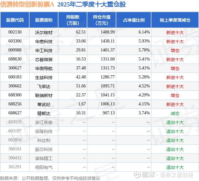 根据2025基金半年报公募基金重仓股数据,重仓该股的公募基金共6家,其中持有数量最多的公募基金为信达澳亚基金的信澳转型创新股票A。信澳转型创新股票A目前规模为1.69亿元,最新净值1.476(9月25日),较上一交易日下跌0.27%,近一年上涨133.54%。该公募基金现任基金经理为朱然。朱然在任的基金产品包括:信澳智选先锋一年持有期混合A,管理时间为2022年6月14日至今,期间收益率为23.6%;信澳匠心臻选两年持有期混合,管理时间为2022年8月16日至今,期间收益率为-8.83%;信澳汇智优选一年持有期混合A,管理时间为2022年11月22日至今,期间收益率为43.9%。