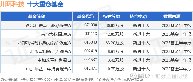 根据2025基金半年报公募基金重仓股数据,重仓该股的公募基金共6家,其中持有数量最多的公募基金为西部利得基金的西部利得事件驱动股票A。西部利得事件驱动股票A目前规模为4.75亿元,最新净值4.0054(9月25日),较上一交易日上涨0.34%,近一年上涨130.86%。该公募基金现任基金经理为张昌平。张昌平在任的基金产品包括:西部利得时代动力混合发起A,管理时间为2022年5月31日至今,期间收益率为62.29%;西部利得新富混合A,管理时间为2025年8月15日至今,期间收益率为2.93%;西部利得CES芯片指数增强A,管理时间为2025年9月6日至今,期间收益率为17.96%。