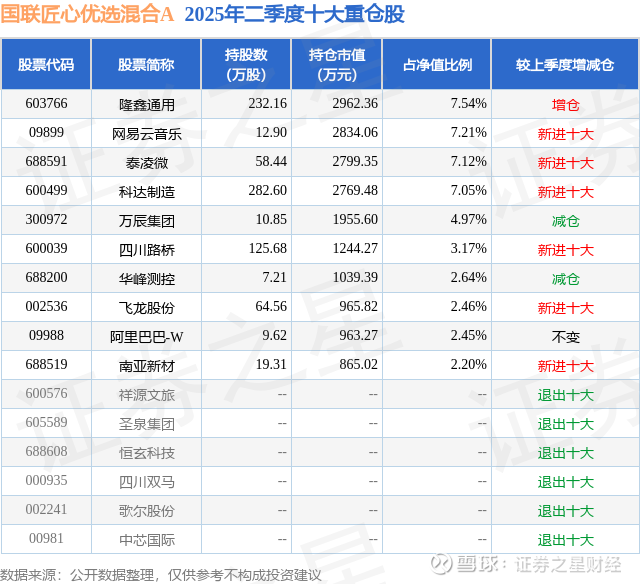 根据2025基金半年报公募基金重仓股数据,重仓该股的公募基金共7家,其中持有数量最多的公募基金为国联基金的国联匠心优选混合A。国联匠心优选混合A目前规模为3.75亿元,最新净值1.0884(9月25日),较上一交易日上涨0.06%,近一年上涨67.45%。该公募基金现任基金经理为王喆 杜超。王喆在任的基金产品包括:国联高股息混合A,管理时间为2024年5月29日至今,期间收益率为11.03%;国联智选先锋股票A,管理时间为2024年6月4日至今,期间收益率为65.93%;国联中证500指数增强A,管理时间为2024年8月20日至今,期间收益率为51.9%;国联沪深300指数增强A,管理时间为2024年11月26日至今,期间收益率为21.09%。杜超在任的基金产品包括:国联央视财经50ETF联接A,管理时间为2023年10月20日至今,期间收益率为23.95%;国联中证500ETF联接A,管理时间为2023年10月20日至今,期间收益率为33.68%;国联中证煤炭指数C,管理时间为2023年10月20日至今,期间收益率为1.6%;国联国证钢铁指数C,管理时间为2023年10月20日至今,期间收益率为18.19%。
