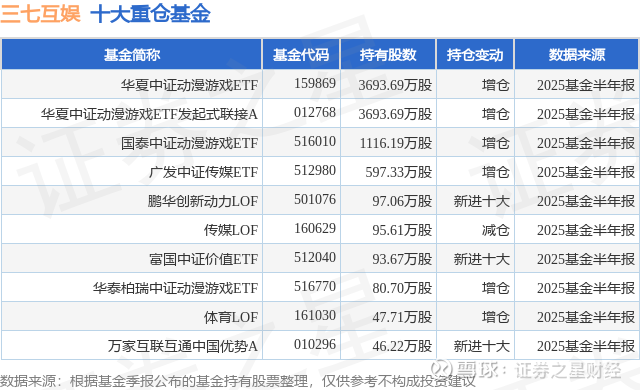 根据2025基金半年报公募基金重仓股数据,重仓该股的公募基金共31家,其中持有数量最多的公募基金为华夏基金的华夏中证动漫游戏ETF。华夏中证动漫游戏ETF目前规模为70.73亿元,最新净值1.6755(9月25日),较上一交易日上涨1.98%,近一年上涨110.36%。该公募基金现任基金经理为鲁亚运。鲁亚运在任的基金产品包括:华夏创业板成长ETF联接A,管理时间为2022年6月10日至今,期间收益率为-0.66%;华夏中证全指证券公司ETF联接A,管理时间为2022年6月10日至今,期间收益率为31.74%;华夏国证疫苗与生物科技指数发起A,管理时间为2022年9月6日至今,期间收益率为-26.18%;华夏战略新兴成指ETF联接A,管理时间为2023年3月27日至今,期间收益率为31.56%。