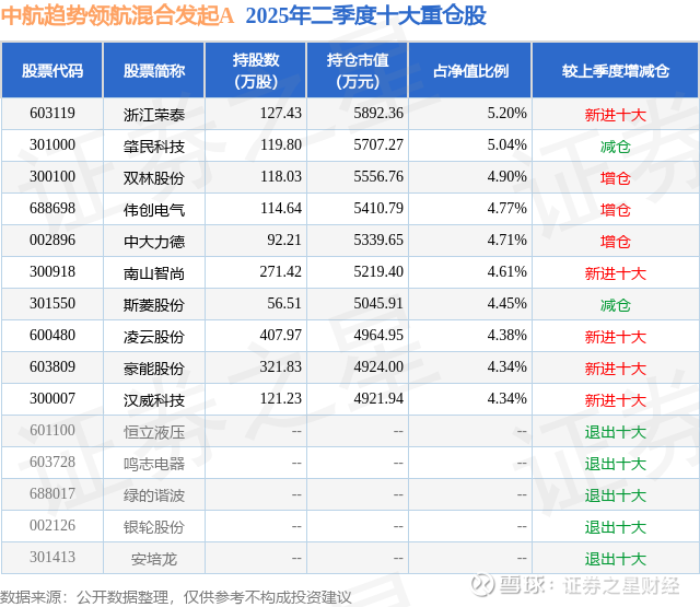根据2025基金半年报公募基金重仓股数据,重仓该股的公募基金共5家,其中持有数量最多的公募基金为中航基金的中航趋势领航混合发起A。中航趋势领航混合发起A目前规模为1.71亿元,最新净值2.7641(9月25日),较上一交易日下跌0.09%,近一年上涨184.99%。该公募基金现任基金经理为王森。王森在任的基金产品包括:中航恒宇港股通价值优选混合发起A,管理时间为2023年9月27日至今,期间收益率为15.76%;中航远见领航混合发起A,管理时间为2024年8月30日至今,期间收益率为61.28%;中航优选领航混合发起A,管理时间为2024年12月24日至今,期间收益率为99.67%。