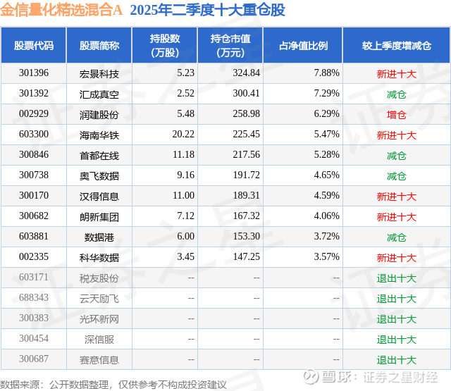 根据2025基金半年报公募基金重仓股数据,重仓该股的公募基金共1家,其中持有数量最多的公募基金为金信基金的金信量化精选混合A。金信量化精选混合A目前规模为0.26亿元,最新净值1.3199(9月25日),较上一交易日上涨0.71%,近一年上涨1.64%。该公募基金现任基金经理为谭佳俊。谭佳俊在任的基金产品包括:金信核心竞争力混合A,管理时间为2025年1月4日至今,期间收益率为34.23%;金信智能中国2025混合A,管理时间为2025年3月20日至今,期间收益率为5.36%。