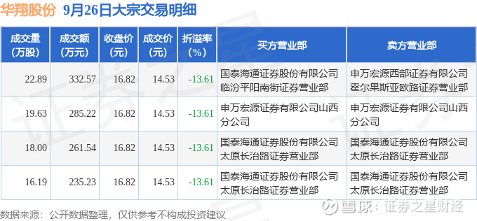 证券之星消息,9月26日华翔股份发生大宗交易,交易数据如下: