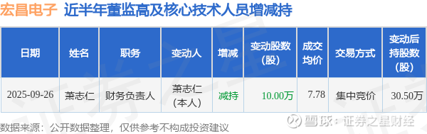 证券之星消息,根据9月26日市场公开信息、上市公司公告及交易所披露数据整理,宏昌电子(603002)最新董监高及相关人员股份变动情况:2025年9月26日公司财务负责人萧志仁共减持公司股份10.0万股,占公司总股本为0.0088%。变动期间公司股价下跌5.13%,9月26日当日收盘报7.76元。
