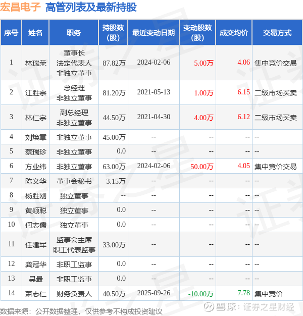 宏昌电子近半年内的董监高及核心技术人员增减持详情如下: