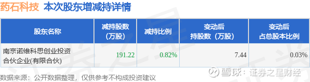 证券之星消息,9月26日药石科技发布公告《药石科技:关于控股股东、实际控制人及其一致行动人权益变动触及1%整数倍的公告》,其股东南京诺维科思创业投资合伙企业(有限合伙)于2025年9月13日至2025年9月26日间合计减持191.22万股,占公司目前总股本的0.8179%,变动期间该股股价下跌8.44%,截止9月26日收盘报40.68元。