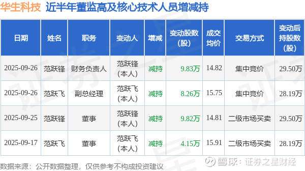 证券之星消息,根据9月26日市场公开信息、上市公司公告及交易所披露数据整理,华生科技(605180)最新董监高及相关人员股份变动情况:2025年9月17日至2025年9月25日公司董事范跃飞、董事范跃锋共减持公司股份13.97万股,占公司总股本为0.0827%。变动期间公司股价下跌7.73%,9月25日当日收盘报14.8元。