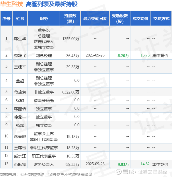 华生科技近半年内的董监高及核心技术人员增减持详情如下: