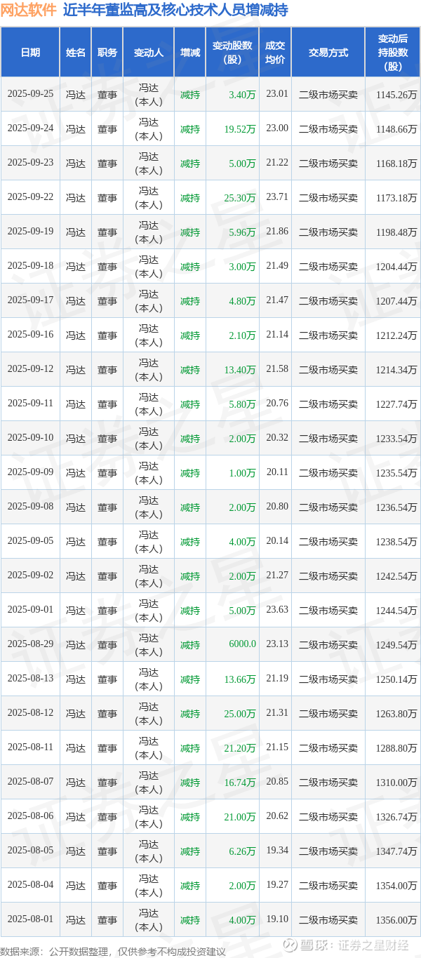 网达软件近半年内的董监高及核心技术人员增减持详情如下: