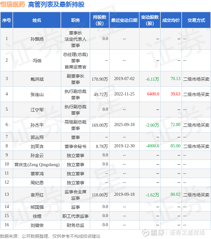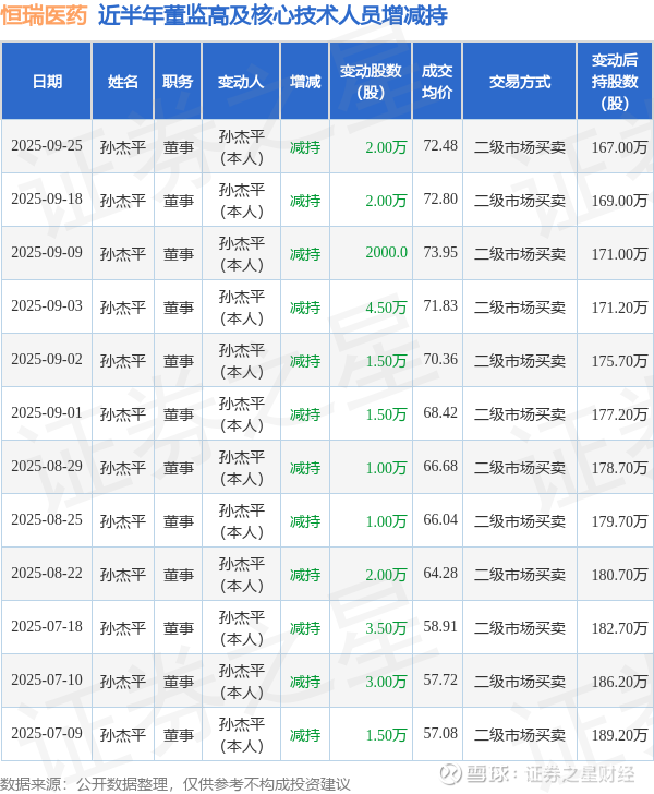 证券之星消息,根据9月26日市场公开信息、上市公司公告及交易所披露数据整理,恒瑞医药(600276)最新董监高及相关人员股份变动情况:2025年9月25日公司董事孙杰平共减持公司股份2.0万股,占公司总股本为0.0003%。变动期间公司股价上涨3.08%,9月25日当日收盘报72.27元。