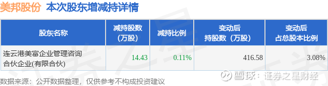 证券之星消息,9月26日美邦股份发布公告《美邦股份:陕西美邦药业集团股份有限公司股东减持计划期间届满暨股份减持结果公告》,其股东连云港美富企业管理咨询合伙企业(有限合伙)于2025年7月11日至2025年9月5日间合计减持14.43万股,占公司目前总股本的0.1067%,变动期间该股股价上涨22.58%,截止9月5日收盘报23.72元。