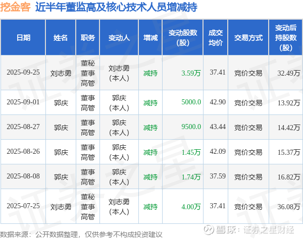 挖金客近半年内的董监高及核心技术人员增减持详情如下: