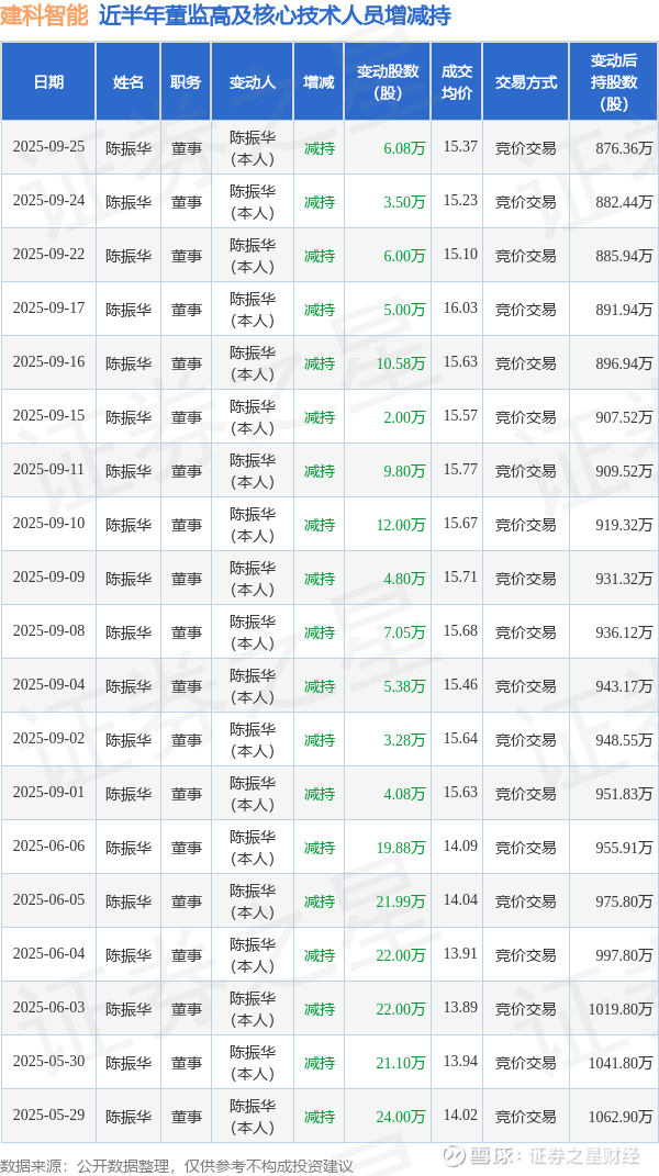 建科智能近半年内的董监高及核心技术人员增减持详情如下: