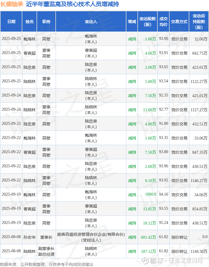 长盛轴承近半年内的董监高及核心技术人员增减持详情如下: