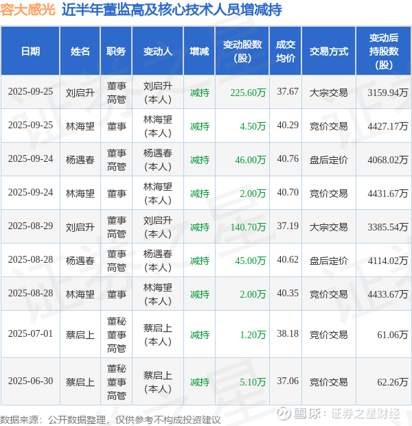 容大感光近半年内的董监高及核心技术人员增减持详情如下: