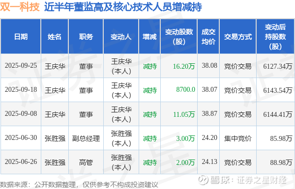 双一科技近半年内的董监高及核心技术人员增减持详情如下: