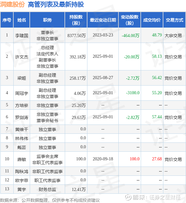润建股份近半年内的董监高及核心技术人员增减持详情如下: