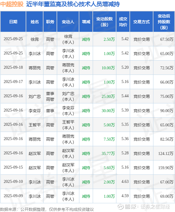 中超控股近半年内的董监高及核心技术人员增减持详情如下: