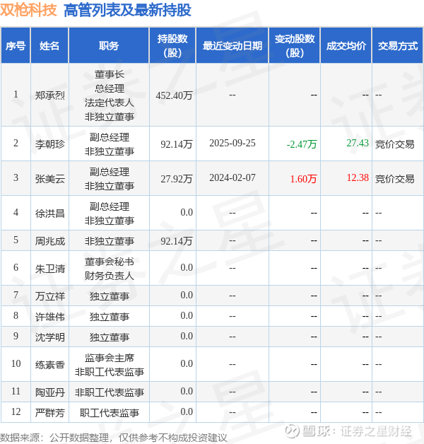 双枪科技近半年内的董监高及核心技术人员增减持详情如下: