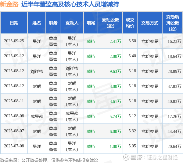 新金路近半年内的董监高及核心技术人员增减持详情如下: