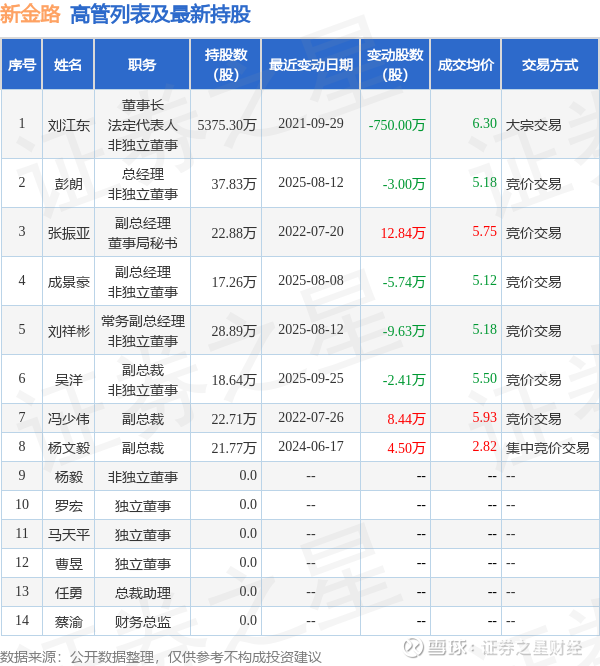 新金路的高管列表及最新持股情况如下: