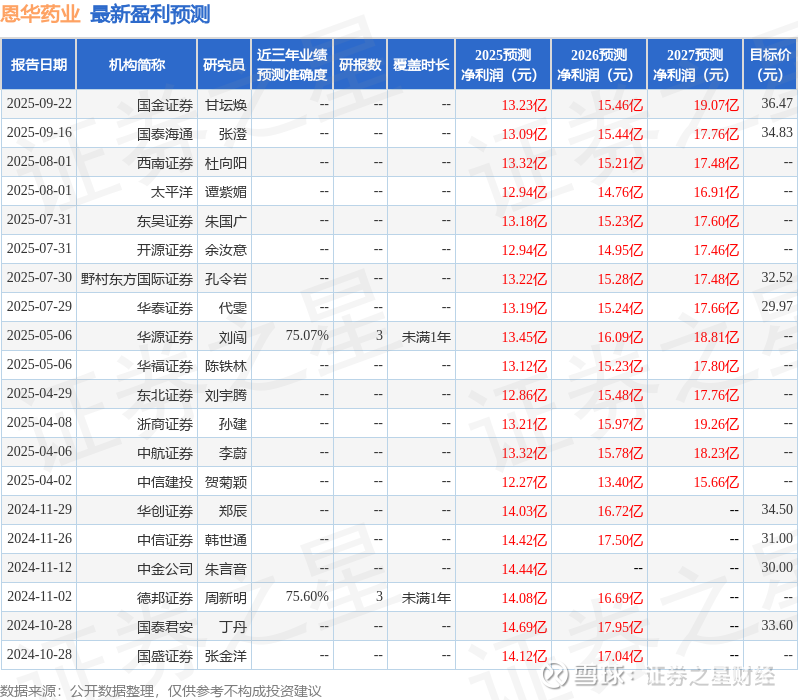 最新盈利预测明细如下: