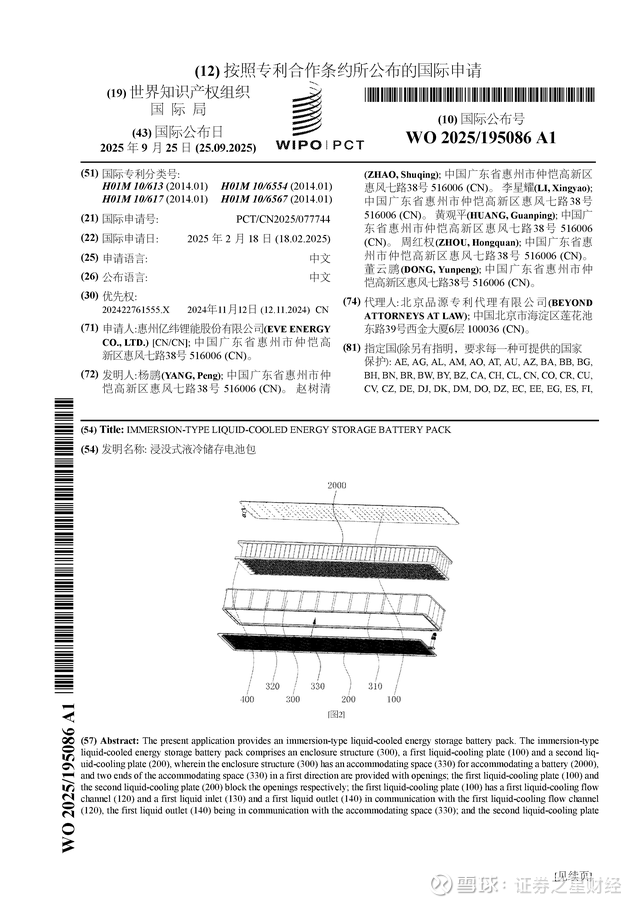 证券之星消息,根据企查查数据显示亿纬锂能(300014)公布了一项国际专利申请,专利名为“浸没式液冷储存电池包”,专利申请号为PCT/CN2025/077744,国际公布日为2025年9月25日。